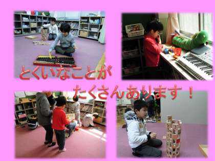 木琴を音楽に合わせて上手に演奏したり,つみ木を自分のおへそあたりまで積んだり,ドミノをしたり,ブロックをつなげていろいろな形を作ったり,見ていて「いつのまにこんなことができるようになったの?」驚くくらい,いろいろなことができるようになりました。