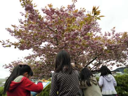 今,梅小路公園には様々な種類の桜やツツジなどの花が春を象徴するかのように咲き誇っています。クローバーももりもりと生えています。四つ葉のクローバーを発見した子もいました。