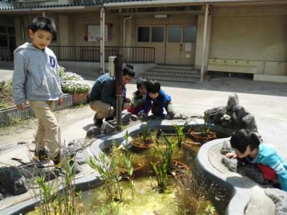 そして,運動場も探検に行きました。じっくり池を見ていると多くの生き物が住んでいました。池に住んでいる小さな生き物たちの動きなどじっくり観察していました。