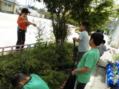 その後,学級園の畑づくりのため,みんなで草抜きをしました。