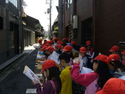 社会科の学習で,「町のいろいろを見つけよう」という学習をしています。梅小路の町に出て,自分たちの住んでいる町にあるものを見つけ,最後に地図を作ろうとしています。