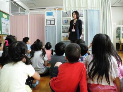 今日は保健室へ行って視力検査をしました。穴のあいているところを指さしていきます。