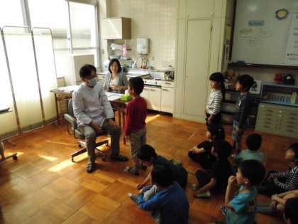 今日は保健室で眼科検診でした。眼科の宮谷先生に目を見てもらいました。