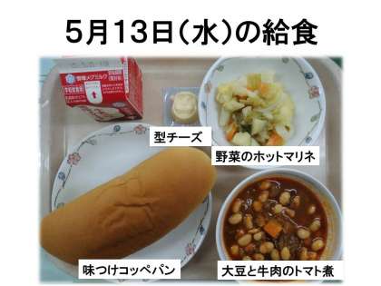 味つけコッペパン・牛乳・大豆と牛肉のトマト煮・野菜のホットマリネです。