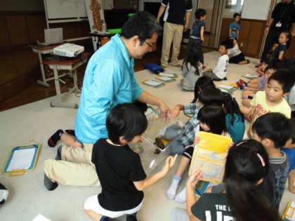 5月19日,京都水族館からオオサンショウウオのお話をしに来てくださいました。京都水族館にいるオオサンショウウオの中で一番大きなものは142センチメートルもあり,2年生の子どもたちと背比べをしました。「オオサンショウウオのほうが大きい!」オオサンショウウオの名前の由来である「山椒」のにおいと「オオサンショウウオ」のにおいをかぎ比べたら,「似てる!」なるほど,ツンとするにおいがしました。オオサンショウウオの赤ちゃんは,あのウーパールーパーにそっくり。「かわいい!」子どもたちは身を乗り出してクイズに答えていました。本物のオオサンショウウオは,天然記念物ですので,学校には来ませんでしたが,鴨川の上流など,水のきれいなところにもいるそうです。でもつかまえたりしないで,見守ることが大切だと,子どもたちは学びました。