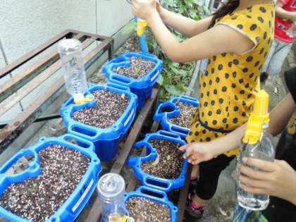 水やりから帰ってきた子どもが元気いっぱいに教えてくれました。休みの間も大きくなっていたのですね。まだ芽が出ていないものもあります。どのように大きくなるのかさらに楽しみになったようです。