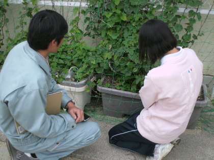 先日ネットをおろして,緑のカーテンの準備を行いましたが,本日は京都市都市緑化協会から来ていただいて作業を行いました。