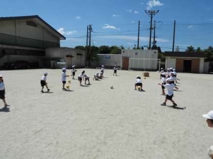 運動場で「ボールあそび」をしました。上に投げたり,転がしたりしました。これからたくさん投げたり受けたりを経験して,上手にボールが操作できるようになりたいですね。