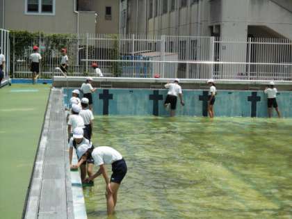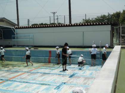 いよいよ始まる水泳学習に向けて,今日は4時間目にプール掃除をしました。たまっている汚れをブラシやたわしを使って磨き,水を流しながらきれいにしていきました。各自の分担に分かれて協力しながら掃除をした後は,ランチルームで学年みんなで給食を頂きました。たくさん動いた後の給食はより一層おいしかったです。