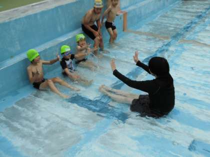 今年度初めての水遊びがありました。みんなこの日を待ちに待っていました。あいにくの天気で,とても寒かったですが,2年生と一緒に水泳学習を始めることができました。今日は超低水位水遊びです。水のかけあいをしたり,顔をつけたり,走ったり,水に慣れることができました。今度は,良い天気のもと水泳学習ができるとよいですね。