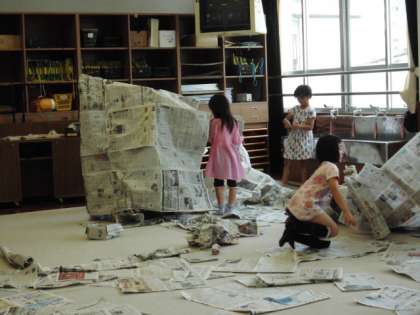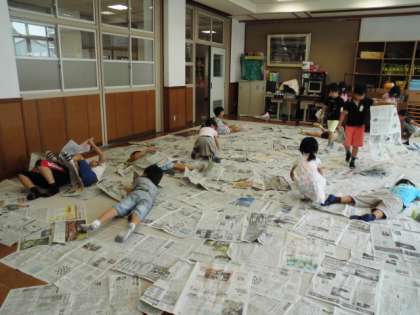 6月24日,図工の学習で造形遊びをしました。多目的室で,新聞紙をたくさん使って遊びました。新聞紙を丸く筒のようにして,ちゃんばらごっこや野球ごっこをする人。新聞紙をたくさんテープでとめて,基地や家を作る人。服のように身にまとう人など。大きな紙を生かして,友達と一緒に楽しむことができました。