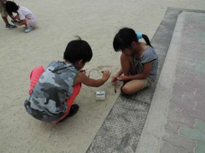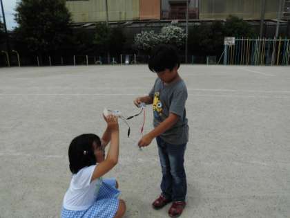 理科で「電池のはたらき」を学習しています。今日は光電池を使ってモーターを回しました。あいにくの梅雨空でなかなか太陽が顔を出してくれません。子ども達は雨乞いならぬ太陽乞いをして太陽が顔を出すのをしばらく待っていました。一瞬陽がさしたそのとき,勢いよくモーターが回転しました。光電池に手をかざして光をさえぎったり,向きを変えたりしながら光電池の電流の大きさを確かめていました。