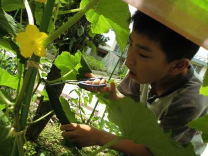 それは,うぐいす学級の学校園で育ててきた”きゅうり”を収穫したことです。つい一週間前くらいに黄色の花が咲き,実がなり,今日みんなで収穫しました。「チクチクするな。気を付けや。」「葉っぱの裏には何か虫がいる!」と感動と発見をしました。