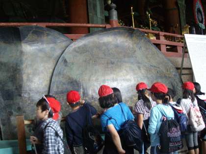 その後ごはんを食べ,東大寺へ向かいました。東大寺では,たくさんの鹿が出迎えてくれました。実際に見る大仏様は,「描いたのよりも大きい」「こんなに大きいや」などと,驚きの声をあげていました。