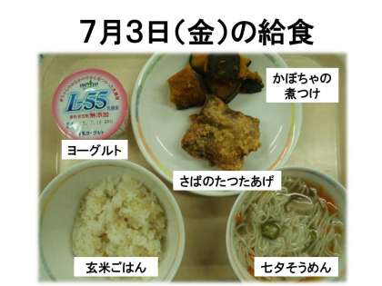 天の川にみたてた「そうめん」と,夜空に浮かぶ星にみたてた「オクラ」を使用した七夕そうめん。夏においしい「かぼちゃ」を使ったかぼちゃの煮つけ。デザートにはヨーグルトがつきました。