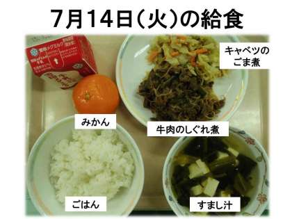 ごはん・牛乳・牛肉のしぐれ煮・キャベツのごま煮・すまし汁・みかんです。
