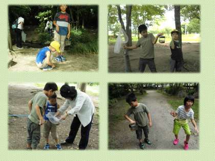 夏を探しに,梅小路公園へ行きました。天気をとても心配しましたが,お天気もみんなの味方をしてくれていたかのようでした。梅小路公園に行くと,「ミーンミーンミーーーーン」とセミの鳴き声があちらこちらから聞こえてきました。みんなで必死にセミを探しましたが,セミは木の高い所にいるのか,まったく見つかりません。