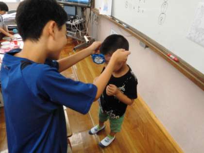 手作りのメダルを首にかけてくれました。その後,嬉しそうにずっと首にかけている姿が見られました。