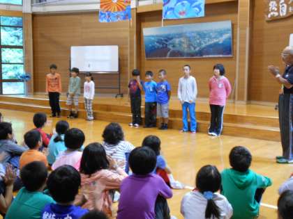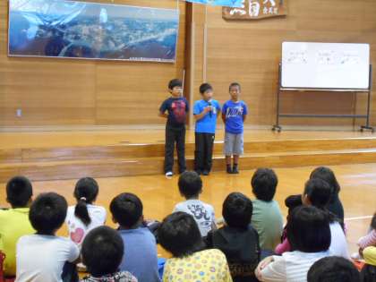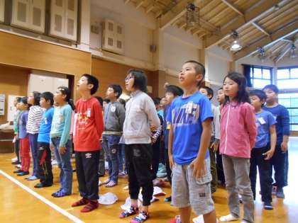 プレイホールで,新林小学校と一緒に朝の集いをしました。