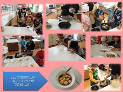 10人が2グループに分かれ,それぞれの活動を分担しながら,とっても美味しいみたらし団子を作りあげました。あっという間にみんなは完食です。「このたれ,めっちゃあまい。」「これ僕が丸めたやつや。」「これは○○さんが丸めたやつやな。」と子どもたちはとても嬉しそうに食べていました。