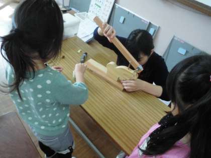 梅小路公園で拾ったどんぐりでこまを作りました。だれのこまが一番長く回るか競争しました。