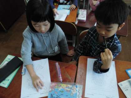 点を結んで形を作ったものを友達に紹介している場面です。指さしながら説明する子も出てきました。また,聞き手はそのできたものを見ながらしっかりと聞くことができました。体もその方を自然に向いています。