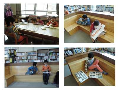 図書室に,本を探しに行きました。図書室では,お気に入りの本を読んでいます。