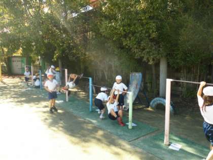 体育の学習で「鉄棒遊び」をしました。今日はぶら下がったり,下りたり,自分のできる技に挑戦しました。
