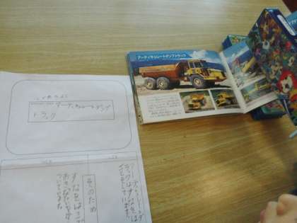 図鑑や絵本の中からお気に入りの乗り物を見つけて,その乗り物の「仕事」や「つくり」を書いています。悩みながらも,「仕事をする」ために「どんなつくり」をしているのかを考えています。