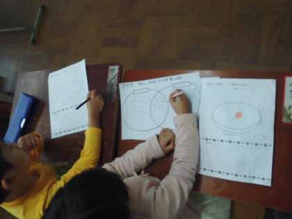 お正月に食べた「おぞうに」をお友達と比べました。比べるときには,ベン図という思考ツールを用いて違いや共通点をはっきりさせました。