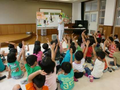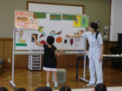 歯のはたらき,6才臼歯のこと,おやつの食べ方など,たくさんのお話をわかりやすく教えていただきました。虫歯いっぱいの写真ときれいな歯の写真を見せながら,「みんなはどっちがいいかな?」と問うと,「きれいな歯がいい!!」と声をそろえた1年生。歯みがきの練習も音楽に合わせてがんばりました。ていねいにみがけたので,口の中もスッキリして気持ちよかったですね!