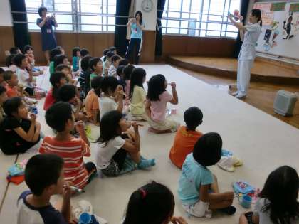 歯科衛生士の先生に来ていただき,1年生の歯みがき指導を行いました。