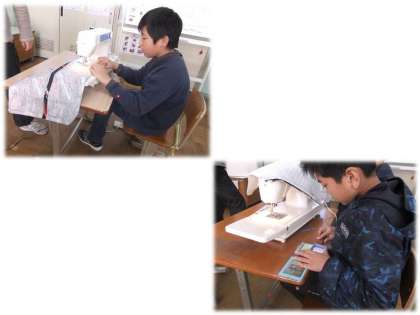 ミシンに慣れてきた高学年の2人。今までに雑巾やうどん屋さんで使うみんなのエプロンなどいろいろなものを作ってきました。