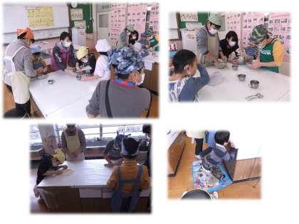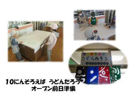 “10人そろえばうどんたろう”オープン前日に,みんなでうどんのしこみを行いました。何度も作ったかいあって,うどん作りも手慣れたものです。明日に備えて,いつもより多く作りました。お客さんに喜んでもらえるように,うどん作りをしていた子どもたち。