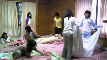 寝た部屋の布団やシーツを協力して片付けています。