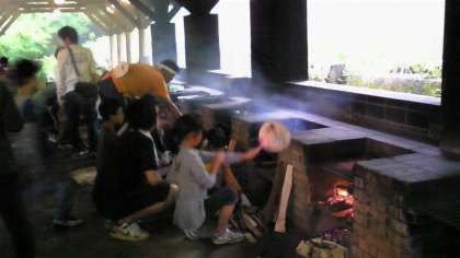 火起こしでは2つの班で火がつきました。その火で釜戸の火も順調につき,野外炊事も進んでいます!