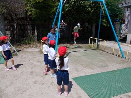 休み時間外で遊んでいると,上級生のお兄さんやお姉さんが話しかけてくれて,鉄棒やブランコの使い方を教えてくれているそうです。