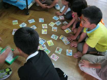 今日は,第2回フレンドリー遊びでした。あいにくの雨でしたが,各教室で楽しく遊ぶことができました。今回は教室でハンカチ落としをして遊ぶグループが多かったです。顔を寄せ合ってカルタや百人一首をしているグループや,ステレオゲーム・花いちもんめで盛り上がっているグループもありました。だいぶメンバー同士の名前も覚えて,仲良くなってきたようです。次回は夏休み明けです。