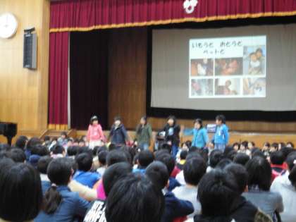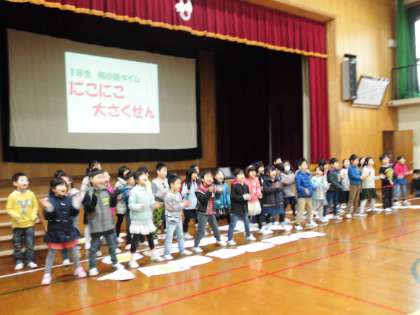 梅小路タイムの発表を行いました。「にこにこ大さくせん」で行ったかぞくをにこにこにしたことと,地域の方をにこにこにしたことを全校のみんなに発表しました。「にこにこのまほう」「えがおのまほう」などたくさんの魔法を伝えることができました。