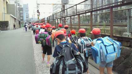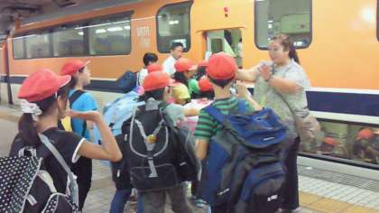 京都駅までの長い道のり、重い荷物が運べるか心配していましたが、一人も後れをとることなく駅に到着!今は電車の中で楽しく過ごしています。