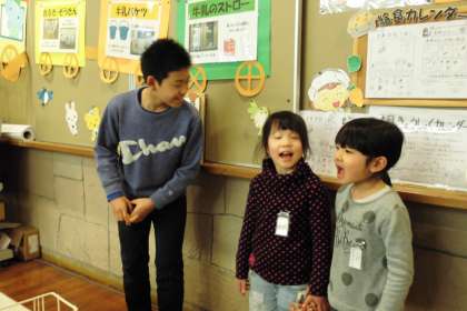 給食週間に交流給食を行いました。6年2組さんとうぐいす学級と1年1組,6年1組さんと1年2組の交流給食です。この日をとても楽しみにしていた1年生。始まって見ると優しいお兄さんとお姉さんが優しく声をかけてくれ,クイズやプレゼントをくれたり,とても楽しい時間となりました。いつも6年生の姿を見て憧れていた1年生。交流給食で,たくさんお話ができ,ますます憧れの気持ちが深まったようです。