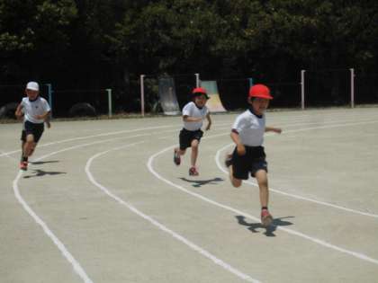 運動会に向けて,80m走を行いました。1年生の時は,50m走だったので,初めての80m走です。コースの走り方やポイントの様子を練習しました。少し長い距離で,走り終わると子どもたちは「つかれた!」「でも気持ちよかった。」と疲れつつも気持ちの良さに気付いたようです。