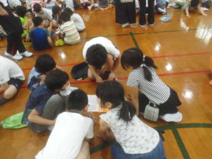 初めてフレンドリー(縦割り)グループで集まりました。自己紹介をした後,次からどこに集まるかが分かるように名札の後ろに入れておくカードをプレゼントしました。グループごとにそれぞれデザインが違います。最後にどのような遊びをこれからしていきたいか意見を出してもらいました。