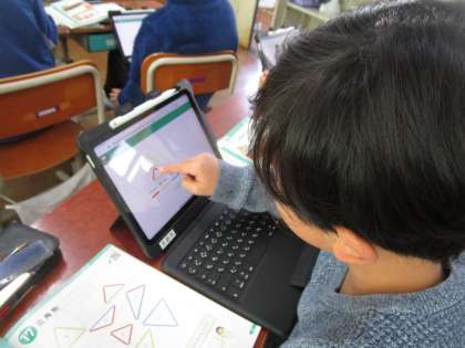 算数科「三角形」では、6cm、8cm、10cm、12cmの棒を使って三角形を作りました。その後、辺の長さに着目して仲間分けし、二等辺三角形、正三角形の意味を捉えることができました。