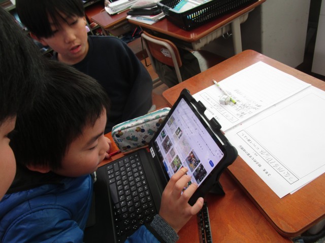 「梅小路のまち もりあげたい」の学習では、自分たちが調べたい場所について、インターネットを使って調べました。グループで分担して取り組むところも見られました。