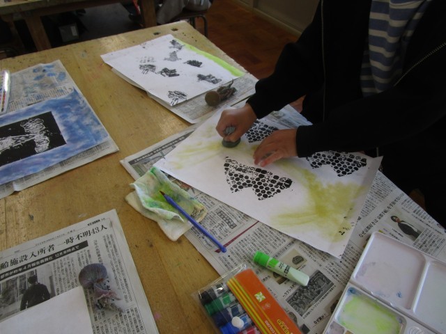 図画工作科「いろいろうつして」では、版を刷った作品にたんぽで色付けしていきました。いろいろな色を混ぜながら、自分がイメージした世界を作り上げていきました。