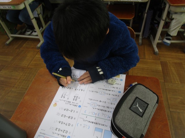 算数科では「小数」のテストに取り組みました。筆算の線も定規で丁寧に引いています。