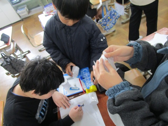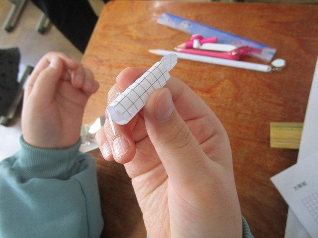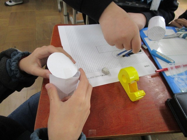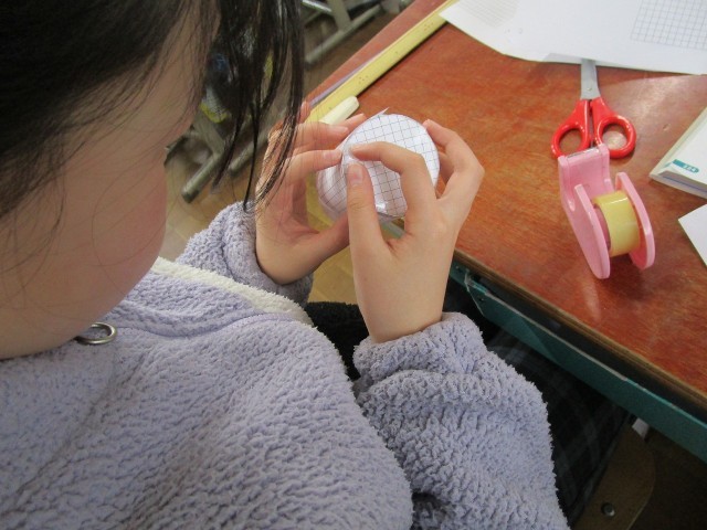 算数では「角柱と円柱」の学習をしています。方眼紙に円柱の展開図をかいて、ハサミで切り、組み立てました。様々なサイズの円柱を作りました。円周の長さを計算して求めたり、円の位置を変えても円柱になるのかを試したりと意欲的に取り組む姿が印象的でした。