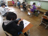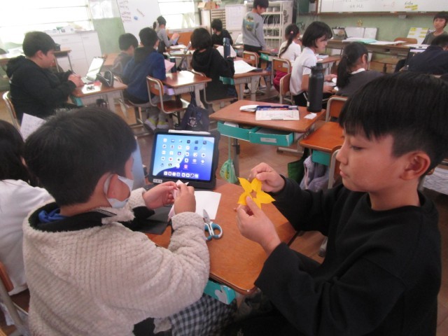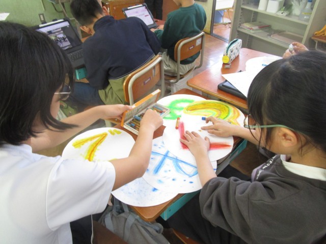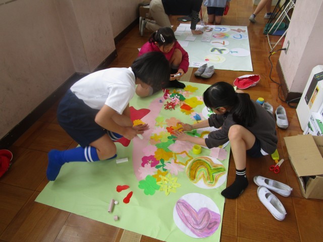 6年生を送る会で飾る掲示物を作る子どもたち。自分の得意なことをいかして、心を込めて作っていきました。