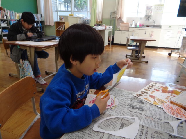 新しい1年生のために、教室に掲示物を作っています。生活科で秋みつけをしたときのことを思い出して、きれいなはっぱの飾りを作りました。他にも、折り紙でクリスマスリースやチューリップなども作りました。